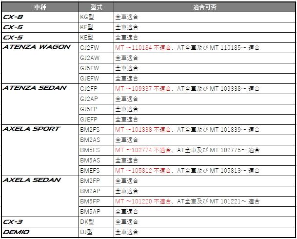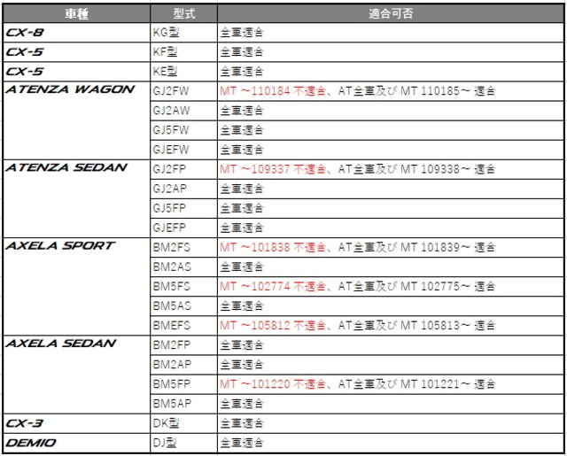 ※最初期のアテンザ/アクセラのMTについては取り付けボルト位置の違いにより、一部不適合車がございます。